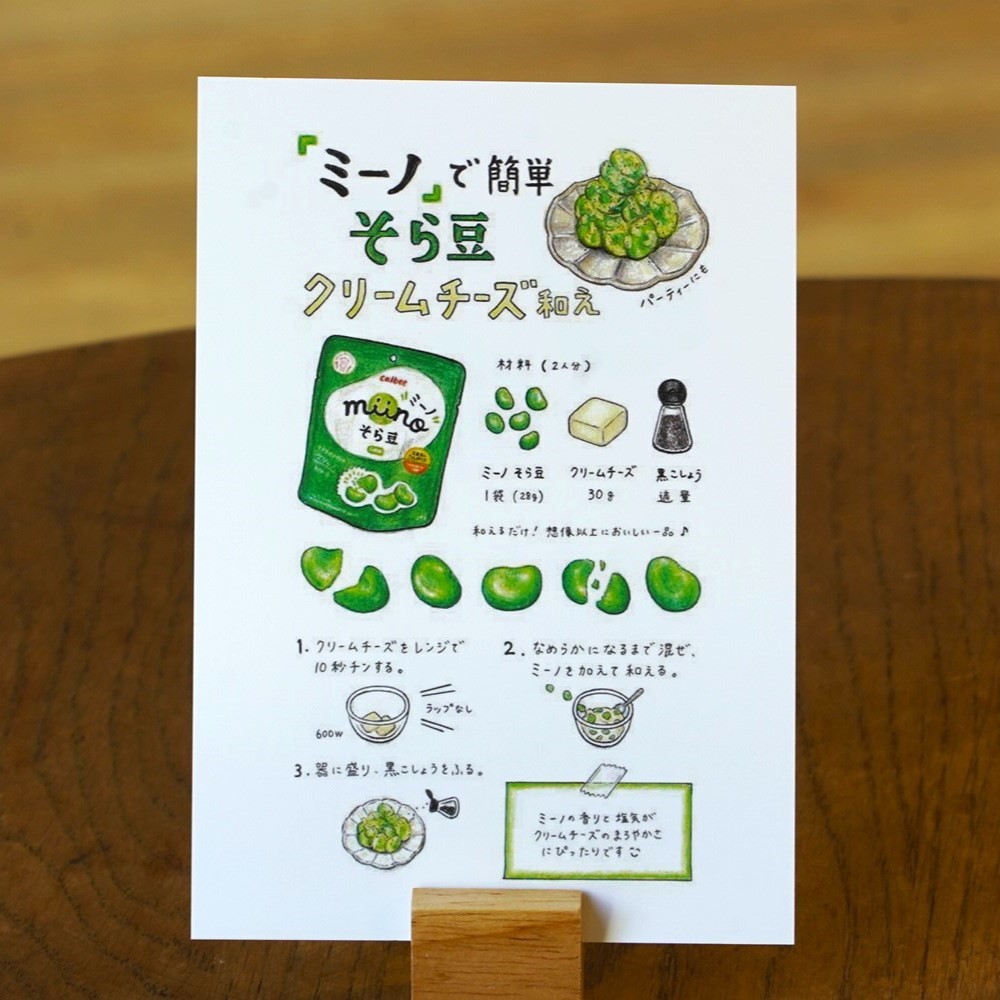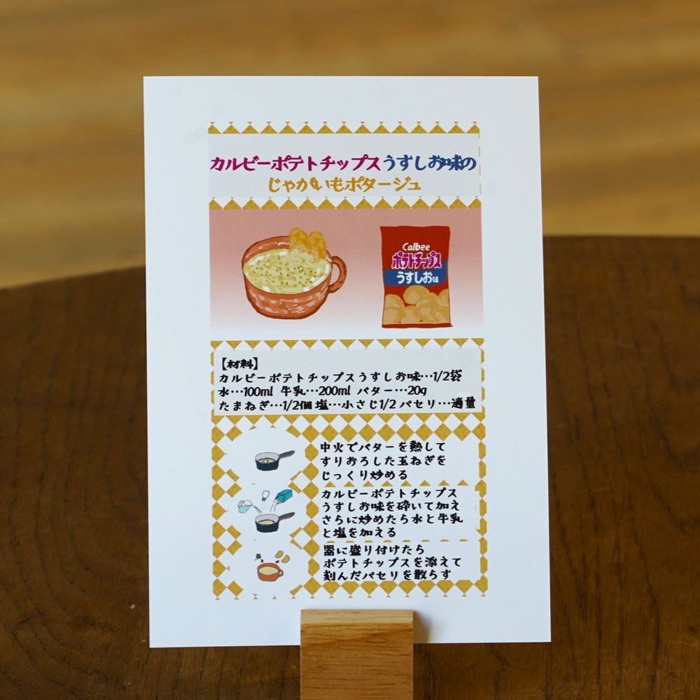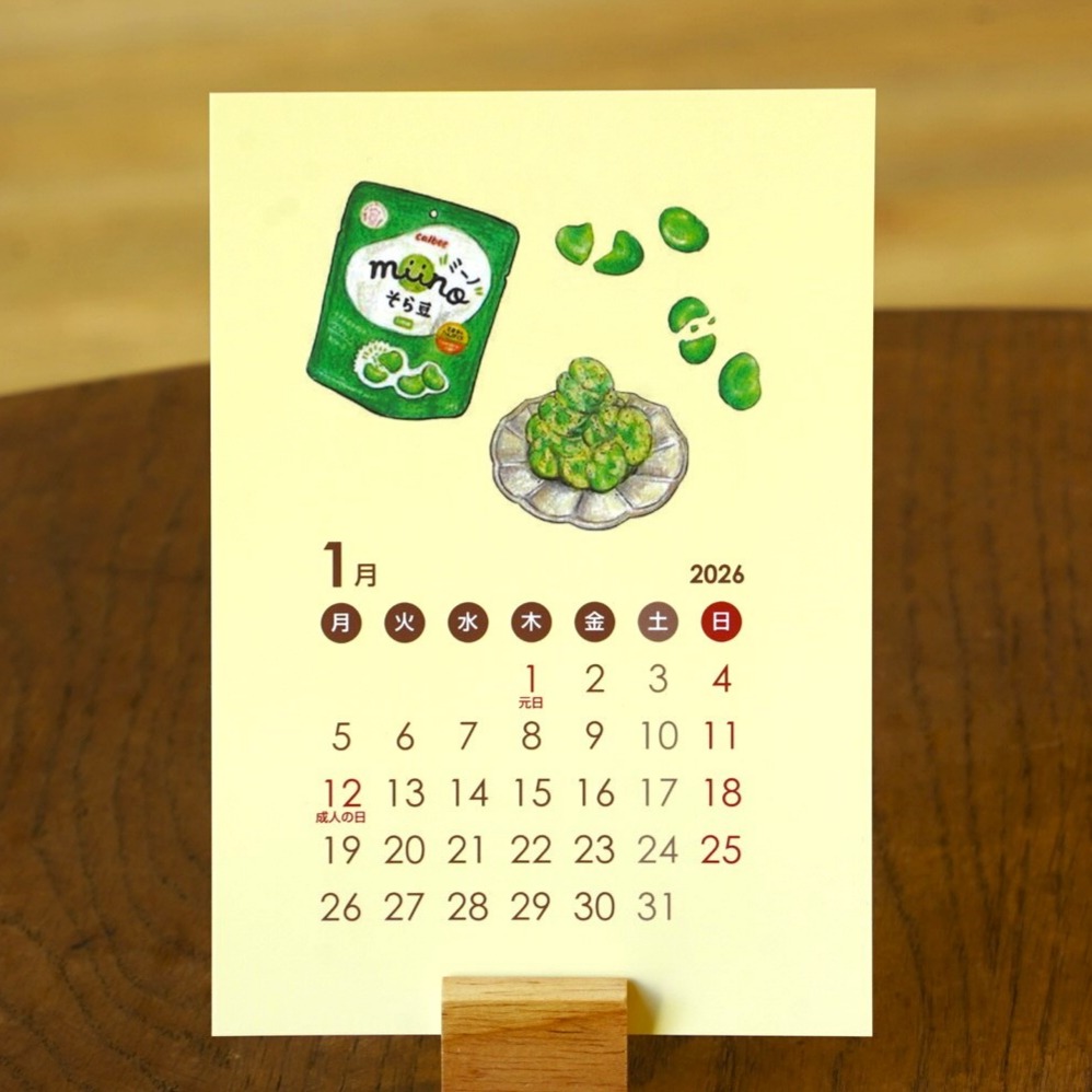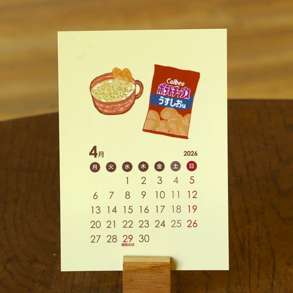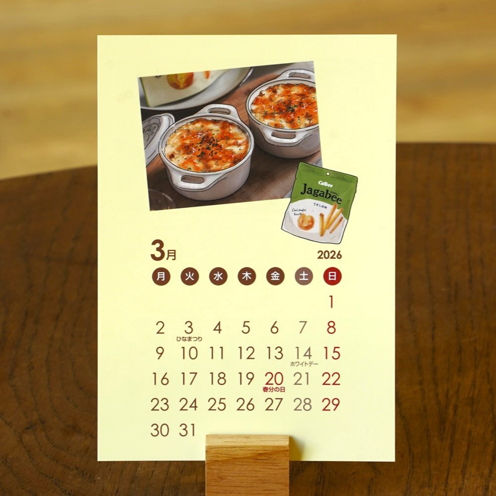 2026年1月始まりの、カルビー商品を使ったアレンジレシピのイラストが描かれたカレンダーです。表面にカレンダー、裏面には、レシピの詳細が描かれており、 レシピカードのようにも使えます。 気軽に作れて、思わず真似したくなる料理を発信している人気クリエイター4名が描き下ろし! 毎月異なるレシピと、カルビーならではの「かっぱえびせんの日」などの豆知識も掲載。ポストカードとしても楽しめて、 冷蔵庫にマグネットで留めたり、ノートに挟んだり…いろいろな使い方ができます。 カレンダーは4名のクリエイターのサインを印字したケースに入れてお届けいたします。 見るたびにほっこり癒される2026年限定カレンダーになっております。