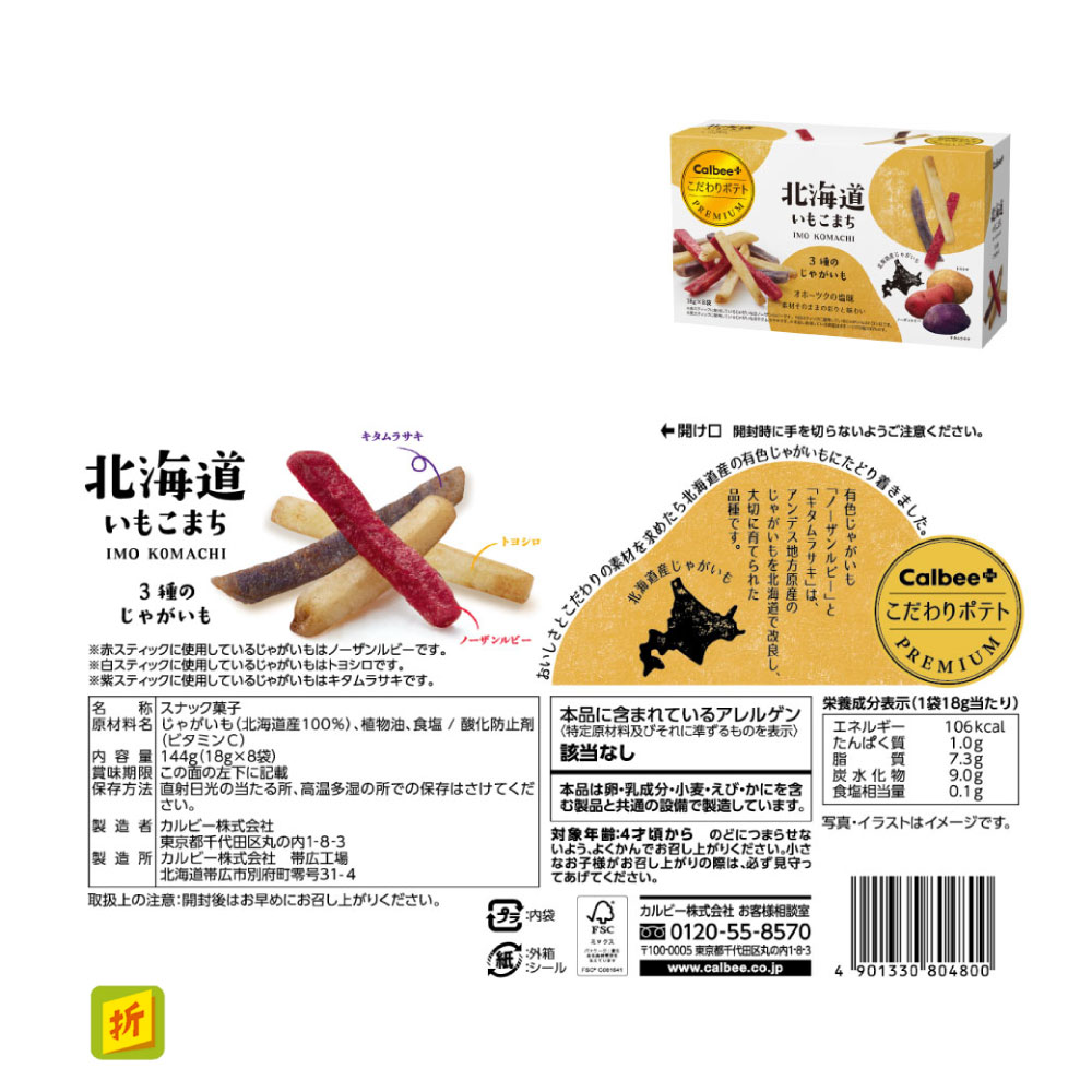 カルビープラスで大人気商品。北海道産のじゃがいも3種類(トヨシロ・ノーザンルビー・キタムラサキ)を使用したカラフルなポテトスナックです。オホーツクの塩でシンプルに味付けしました。じゃがいもの彩りとほくほくした味わいが特徴のプレミアムポテトです。