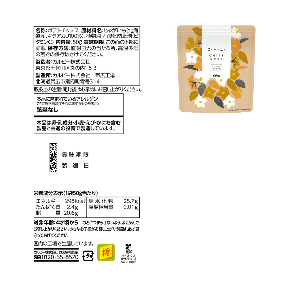 北海道産のじゃがいもを眠らせておいしさをじっくり熟成させた「よくねたいも」のキタアカリを使用。 「CA貯蔵」という特別な貯蔵方法によって、時間の経過とともに甘みを引き出したこだわりの素材です。素材の味に自信があるからこそ、味付けもしていません。他のポテトチップスでは味わえない、 素材本来の甘みと旨みをぜひご堪能ください。