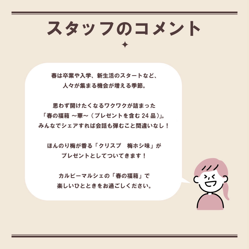 【お届け内容】計24個 ポテトチップス しあわせバタ~(55g) ポテトチップス うすしお味(55g) ポテトチップス コンソメパンチ(55g) ポテトチップス超薄切り コンソメ味(40g) 九州味自慢 熊本ミルクバター味(55g) クリスプ うましお味(105g) 堅あげポテト うすしお味(65g) 堅あげポテト 焼きのり味(65g) 太ーいJagabee たらこバター味(35g) Jagabee うすしお味(38g) miino だいずに味わうミックス黄大豆黒大豆 しお味(30g) miino そら豆しお味三角パック(7g×8袋) かっぱえびせん 紀州の完熟梅味(64g) かっぱえびせん(77g) フルッツ カリッといちご(30g) フルッツ カリッとバナナ(30g) サッポロポテト バーベQあじ(72g) さやえんどう しお味(61g) フルグラボール(26g) フルグラボール アーモンドチョコ味(26g) CHIPS NEXT よくねたいもキタアカリ(50g) 桜ぽてと 桜えび塩味(15g×8袋) 東京ムーンポテト シーソルト&バター味(20g×6袋) 【プレゼント】クリスプ 梅ホシ味(45g) ※1回のご注文で6セットまでとさせていただきます。 ※複数のご注文や他の商品と併せてご注文いただく場合は、商品をまとめて発送いたします。 ※生産計画の都合により掲載中のパッケージと異なる同商品をお届けする可能性がございます。 ※賞味期限45日以上ある商品を発送いたします。 写真はイメージです。