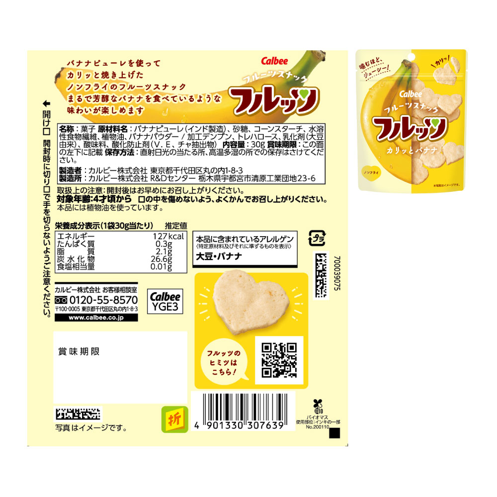 バナナピューレを使ってカリッと焼き上げたノンフライ(*)のフルーツスナック。まるで芳醇なバナナを食べているような味わいが楽しめます。