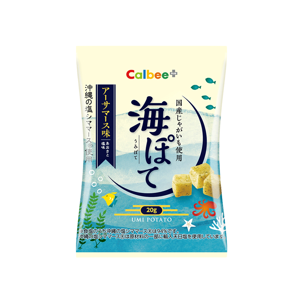 沖縄のCalbeeプラスでは、一番人気で指名買いも多い商品です。一度食べたらリピートしたくなる間違いないおいしさです。 「海ぽて」は沖縄の雰囲気を存分に味わえる商品です。気に入ったからお土産にしたいけど持ち帰るのにちょっとかさばる、という場合でも、カルビーマルシェをご利用いただければご自宅への配送も可能です。