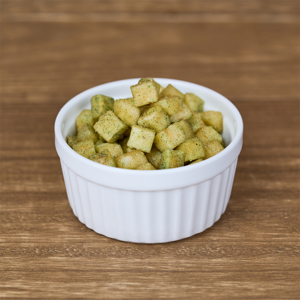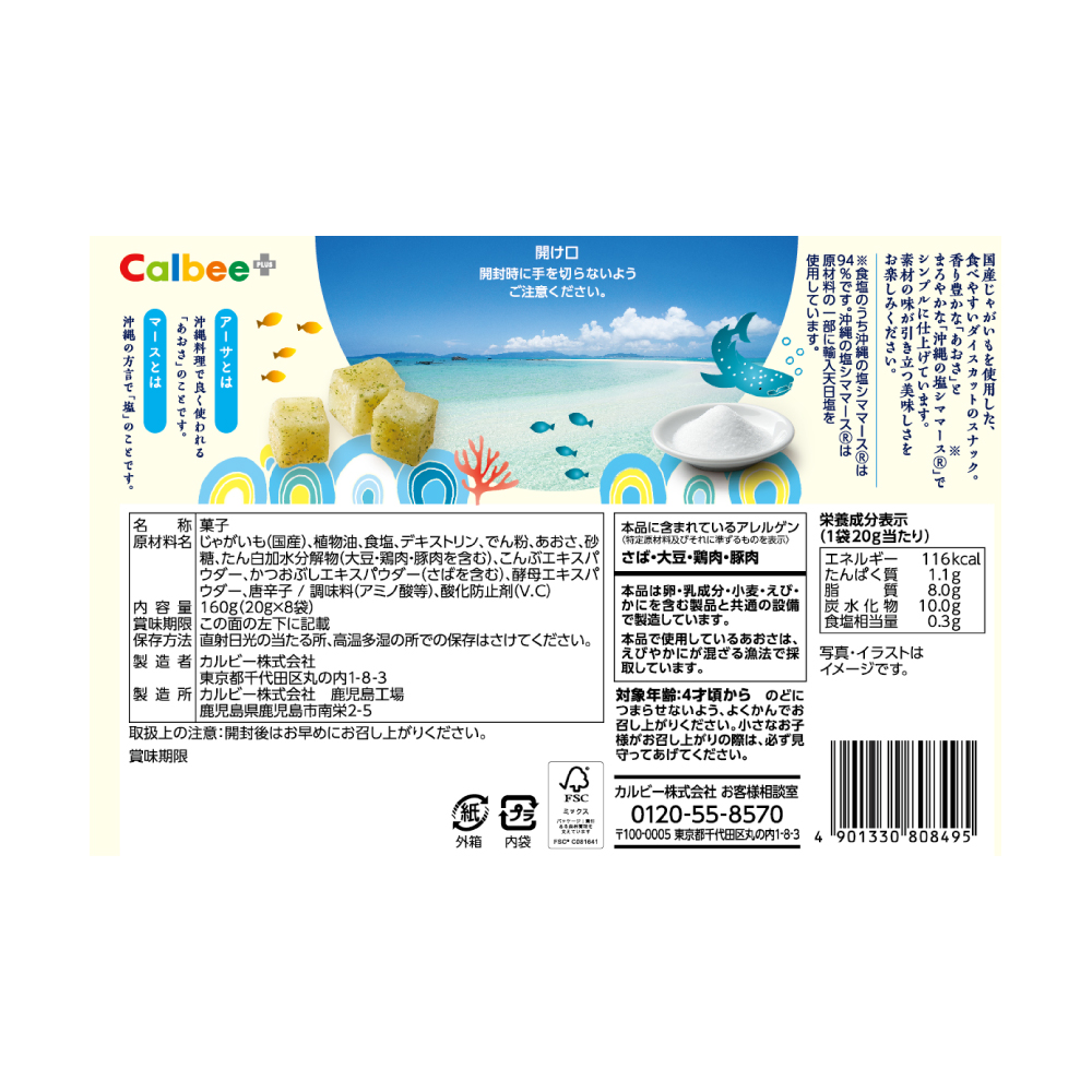 国産じゃがいもを使用したダイスカットのスナック。「アーサ(あおさ)」と「マース(塩)」で味付けた、コクのある沖縄版の「のり塩」味です。