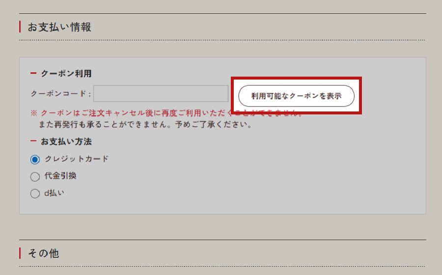 お届け先を設定後、ご注文方法の指定のステップにて、「利用可能なクーポンを表示」から選択