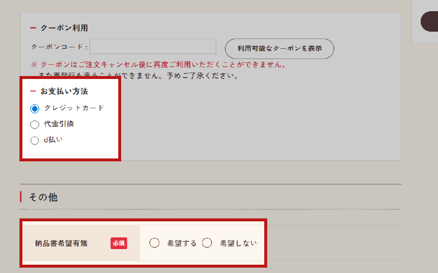 お支払い方法と納品書の希望有無を選択し、ご注文の確認へお進みください。
